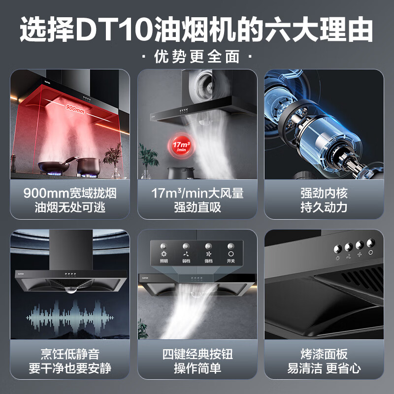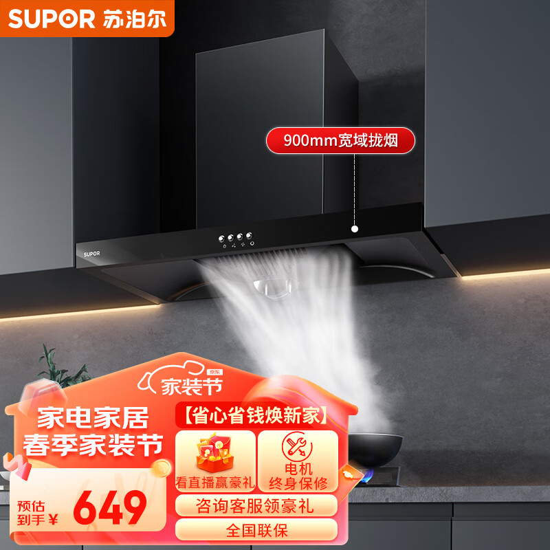 苏泊尔(SUPOR)排油烟机 宽域拢烟大吸力油烟机 家用易清洁欧式顶吸抽油烟机 经典按键操控吸油烟机 DT10价格:649.00元!