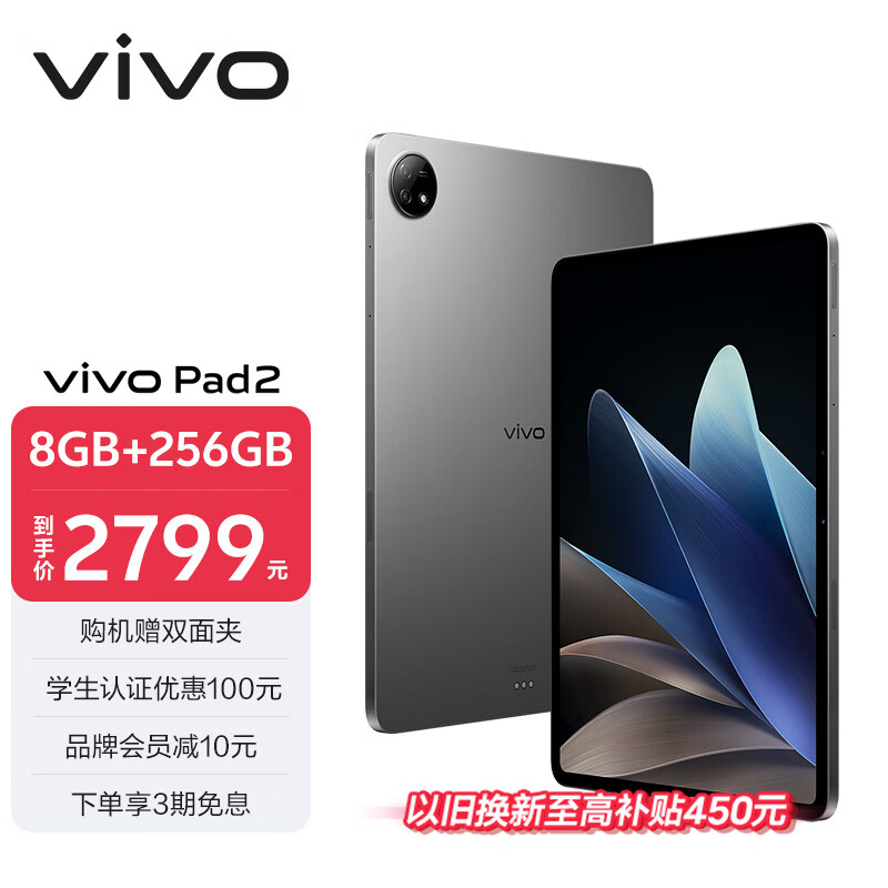 vivo Pad2 12.1英寸平板电脑(天玑9000旗舰芯片 8GB+256GB 144Hz超感原色屏 10000mAh电池)远山灰价格:2799.00元!