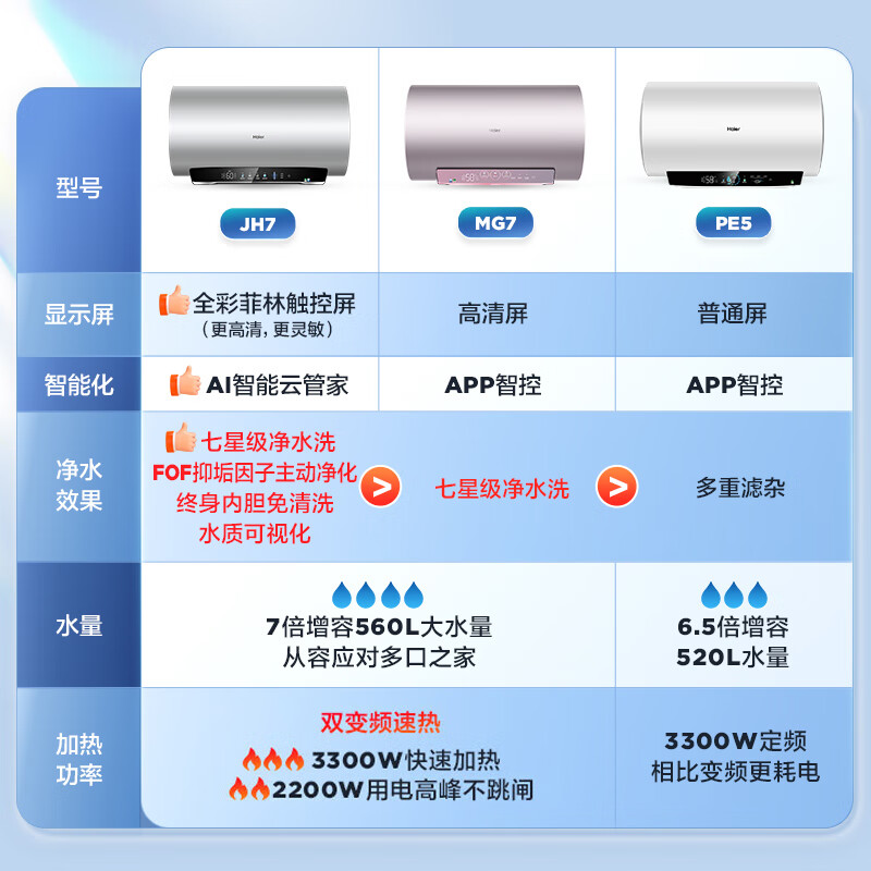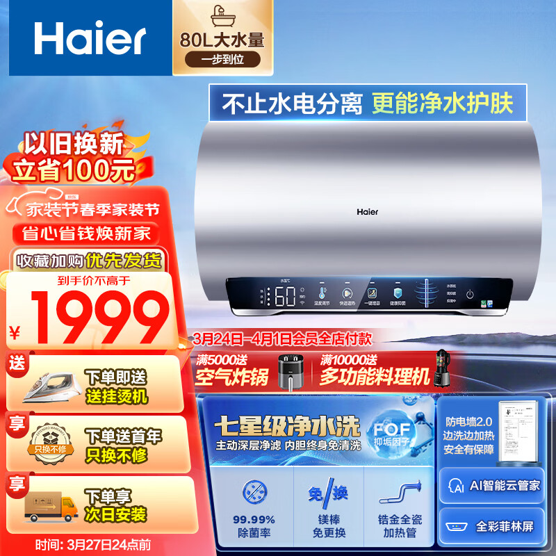 海尔(Haier)80升【金刚无缝胆】美肤洗彩屏触控电热水器家用储水式3300W变频速热一级能效防电墙 EC8002-JH7U1价格:2299.00元!