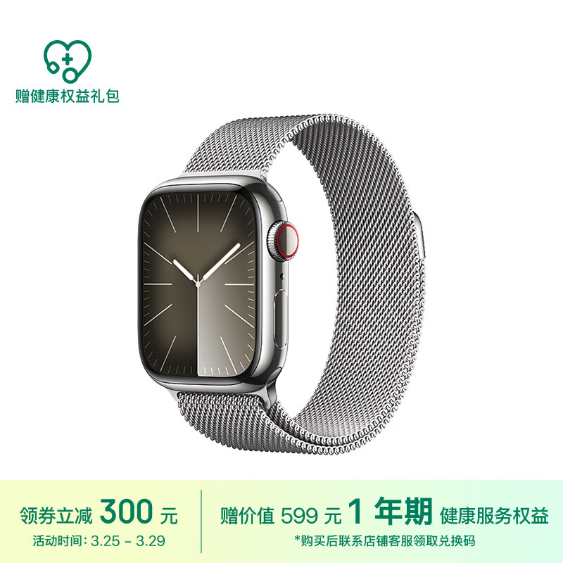 Apple/苹果 Watch Series 9 智能手表GPS+蜂窝款41毫米银色不锈钢表壳银色米兰尼斯表带 MRJV3CH/A价格:6199.00元!