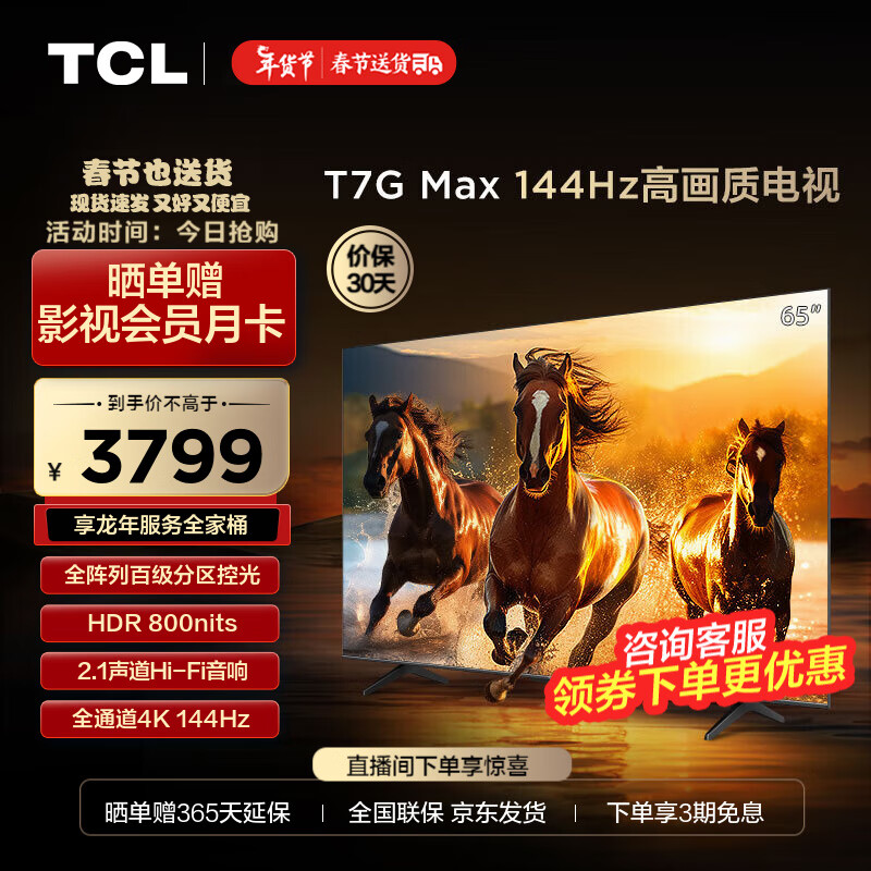 TCL电视 65T7G Max 65英寸 百级分区 HDR 800nits 4K 144Hz 平板电视机 以旧换新 65英寸 官方标配价格:3799.00元!