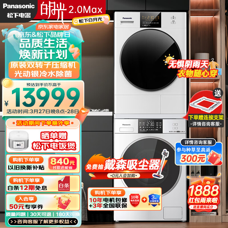 松下(Panasonic)白月光2.0Max 大容量 洗烘套装 12kg滚筒洗衣机+10kg热泵烘干机 冷热除菌 智能投放 3NB1E+EH1015价格:13999.00元!