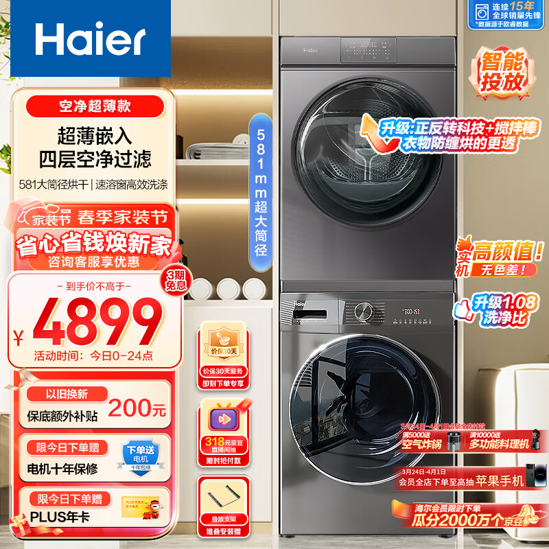 海尔(Haier)超薄全嵌洗烘套装 10Kg滚筒洗衣机+热泵烘干机家用 智能投放 双喷淋 EG100MATE55+EHG100MATE36S价格:5099.00元!
