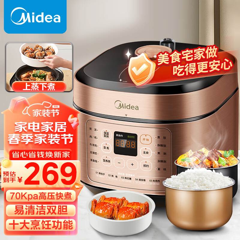 美的(Midea)提鲜系列 智能电锅5L家用多功能易清洁双胆高压快煮上蒸下煮 高压锅YL50X5-201(3-6人食用)价格:289.00元!