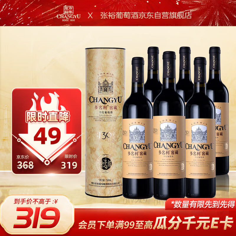 张裕 特选级窖藏赤霞珠干红葡萄酒750ml*6瓶整箱圆筒装国产红酒送礼价格:319.00元!