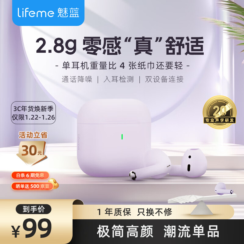 魅蓝魅族lifeme Blus mini真无线蓝牙降噪耳机半入耳式无线耳机蓝牙5.3适用苹果华为小米手机 丁香紫价格:97.90元!