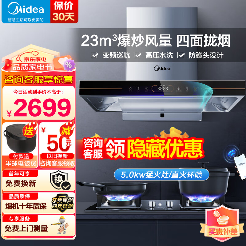 美的(Midea)家用抽油烟机23立方大吸力欧式顶吸油烟机燃气灶具两件烟灶套装一键水洗厨房电器天然气TV701+Q330价格:2599.00元!