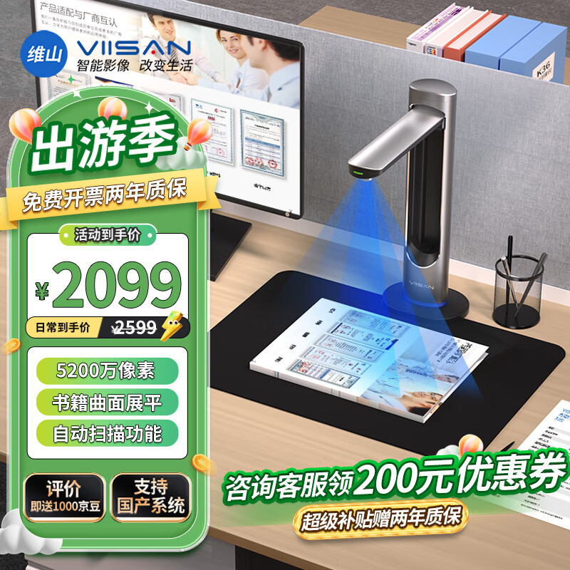 维山(VIISAN)高拍仪 5200万高清像素 AI智能识别扫描仪 A3幅面连续扫描自动展平 扫描仪高拍仪VEE36905价格:2599.00元!