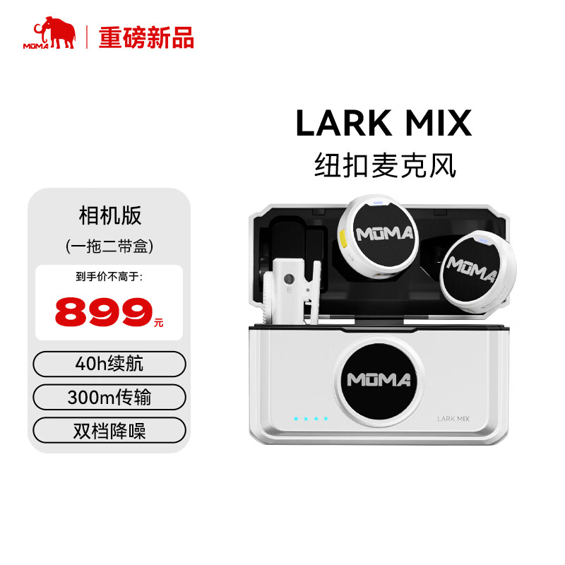 猛玛(MOMA)Lark Mix 一拖二无线领夹麦克风猛犸相机直播vlog户外采访微小型纽扣收音麦相机版白色价格:899.00元!