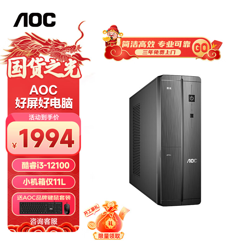 AOC 荣光910 商务办公台式电脑主机(酷睿12代i3-12100 16G 512G WIFI商务键鼠 三年上门)价格:1994.00元!