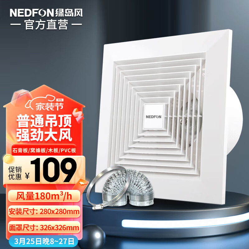 绿岛风(Nedfon)BPT10-22-CH 排气扇厨房管道抽风机木板吊顶排风扇卫生间换气扇价格:109.00元!