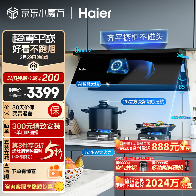海尔(Haier)抽油烟机 超薄近吸烟灶套装 25m3/min变频有效风 顶侧双吸外观 家用吸油烟机燃气灶具C21U1+Q2GE2价格:3399.00元!