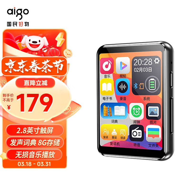 爱国者aigo 803学习版mp3/mp4音乐视频播放器2.8英寸触屏蓝牙外放无损HIFI学生英语随身听电子书 8G黑色价格:179.00元!