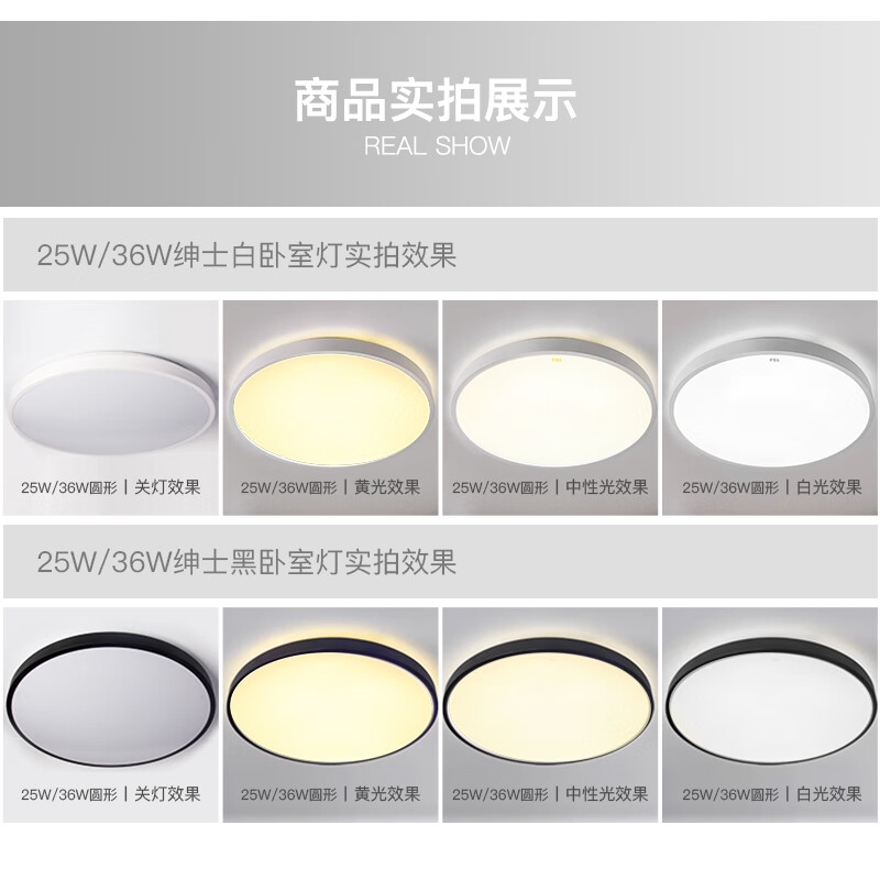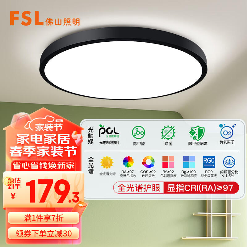 FSL佛山照明全光谱护眼吸顶灯光触媒卧室灯豁免级蓝光Ra97绅士黑36W价格:299.00元!