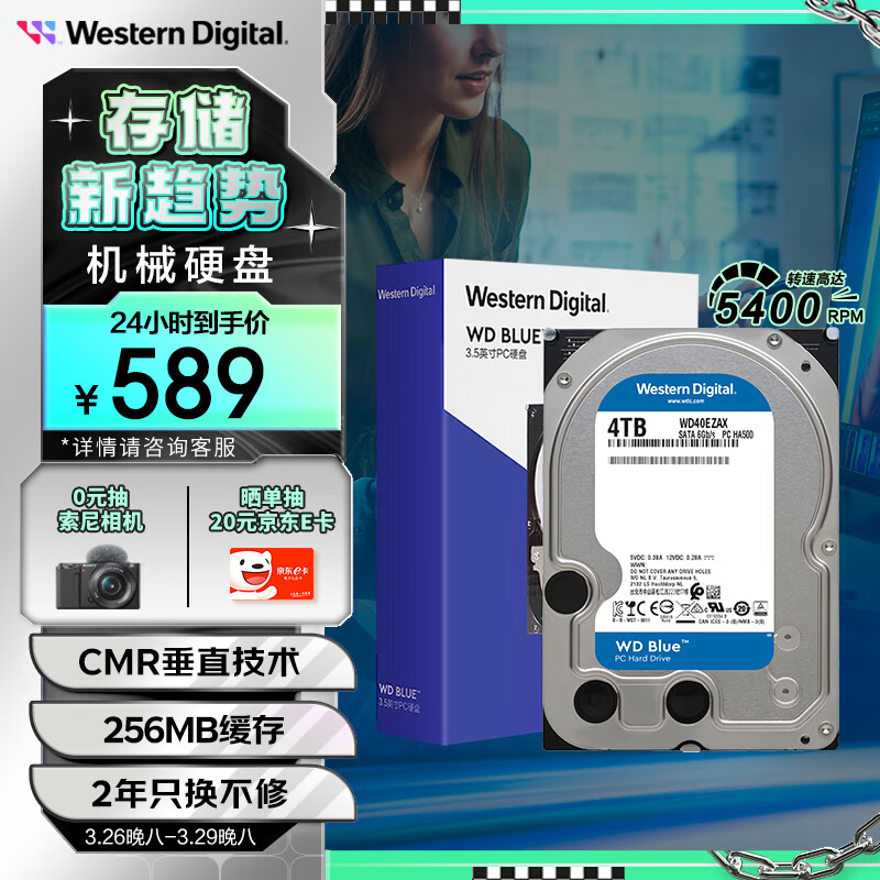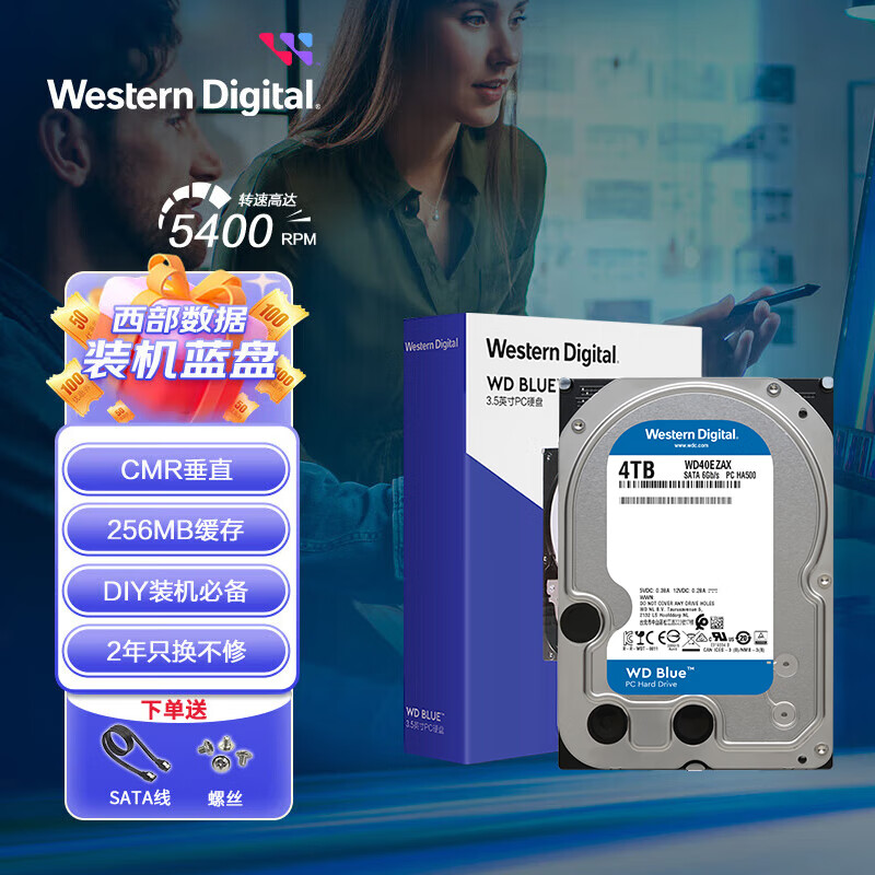 西部数据 台式机机械硬盘 WD Blue 西数蓝盘 4TB CMR垂直 5400转 256MB SATA (WD40EZAX)价格:589.00元!