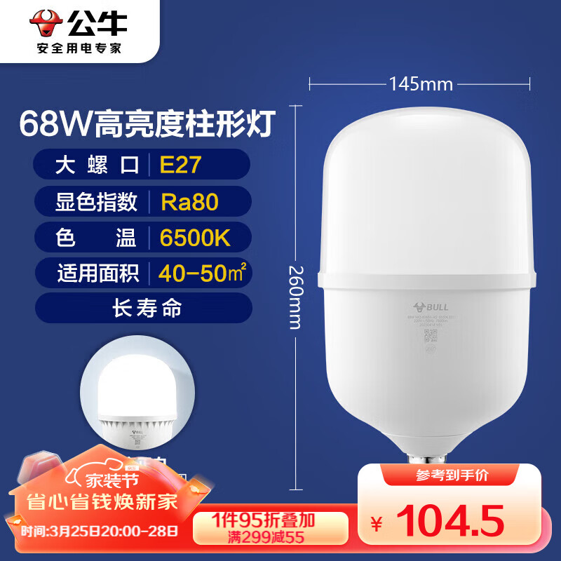 公牛(BULL)LED灯泡高亮柱形灯厂房车间商超食堂 68W球泡白光6500KE27螺口价格:110.00元!