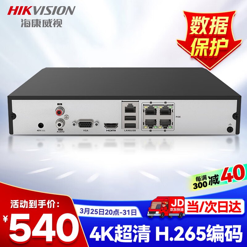 HIKVISION海康威视网络监控硬盘录像机 4路poe网线供电H.265编码1080P解码DS-7804N-K1/4P价格:580.00元!