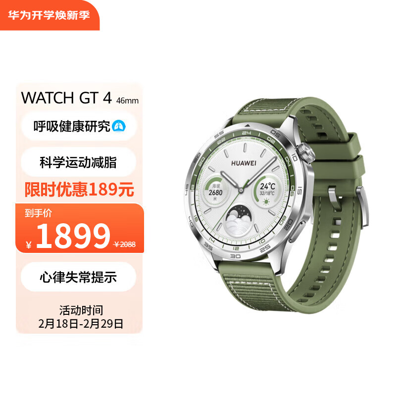 华为WATCH GT4华为手表智能手表呼吸健康研究心律失常提示华为gt4手表云杉绿支持龙年表盘价格:1879.00元!