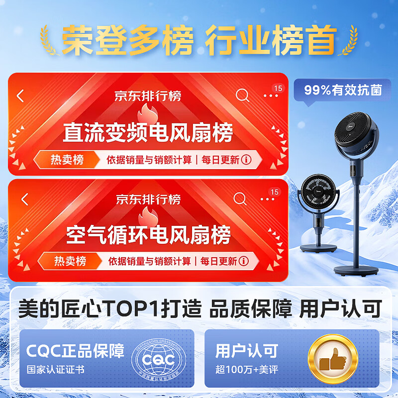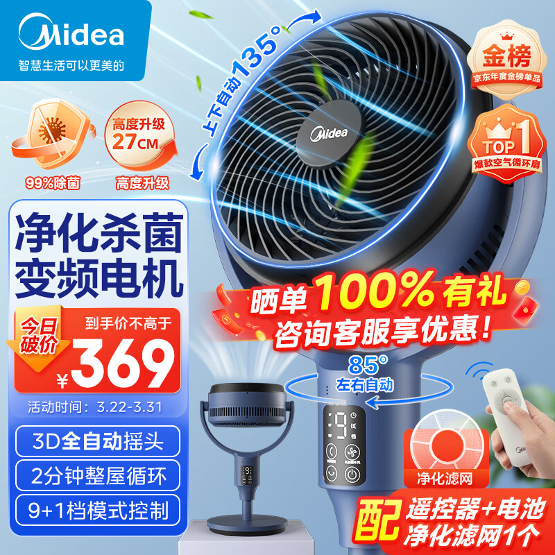 美的(Midea)【99%净化除菌】直流变频四季净化扇/3D摇头空气循环扇/家用落地扇/电风扇轻音桌面小风扇 GDG24ZR价格:459.00元!