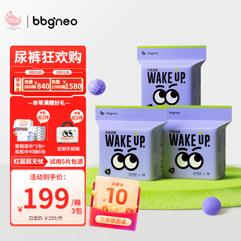 BBG元气觉醒neo系列纸尿裤L码3包箱装84片(9-12kg)婴儿超薄尿不湿价格:199.00元!