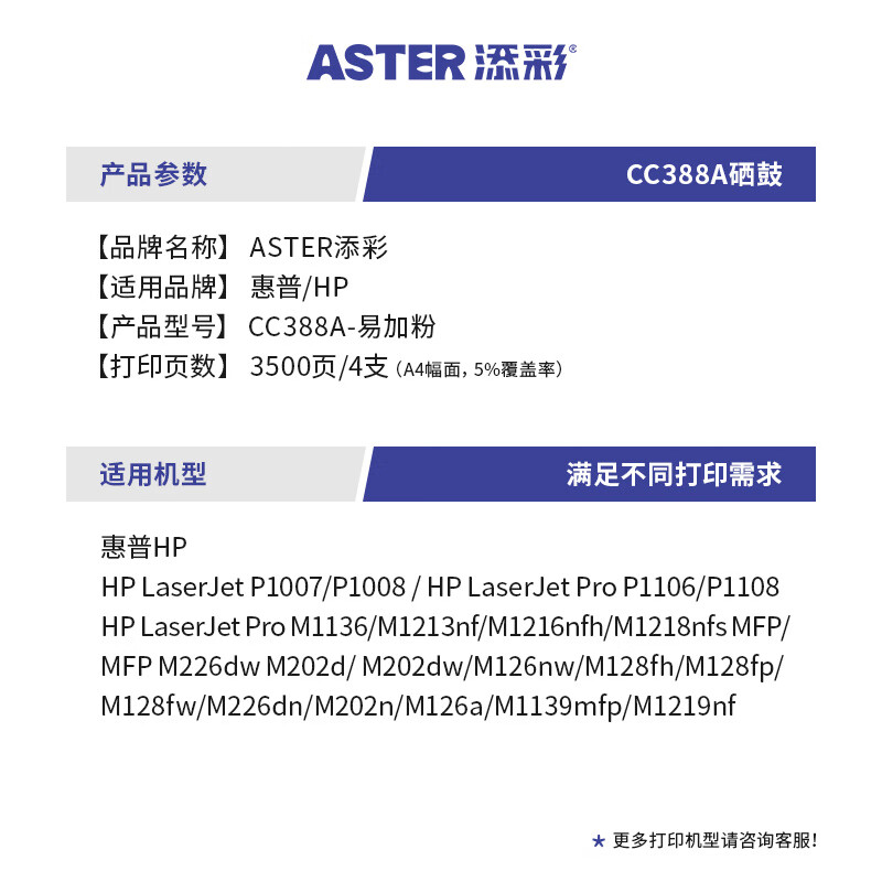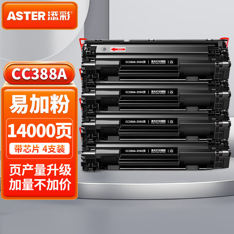 添彩88a硒鼓4支装 适用惠普m1136 CC388a硒鼓M128fw M226dw M202n M1139mfp M1219nf m126a打印机墨盒价格:158.00元!