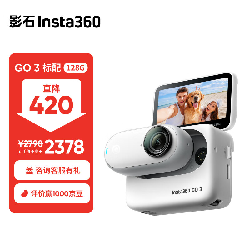 Insta360影石 GO 3拇指相机 运动亲子Vlog骑行宠物防水防抖运动相机(灵动白128G版)价格:2378.00元!