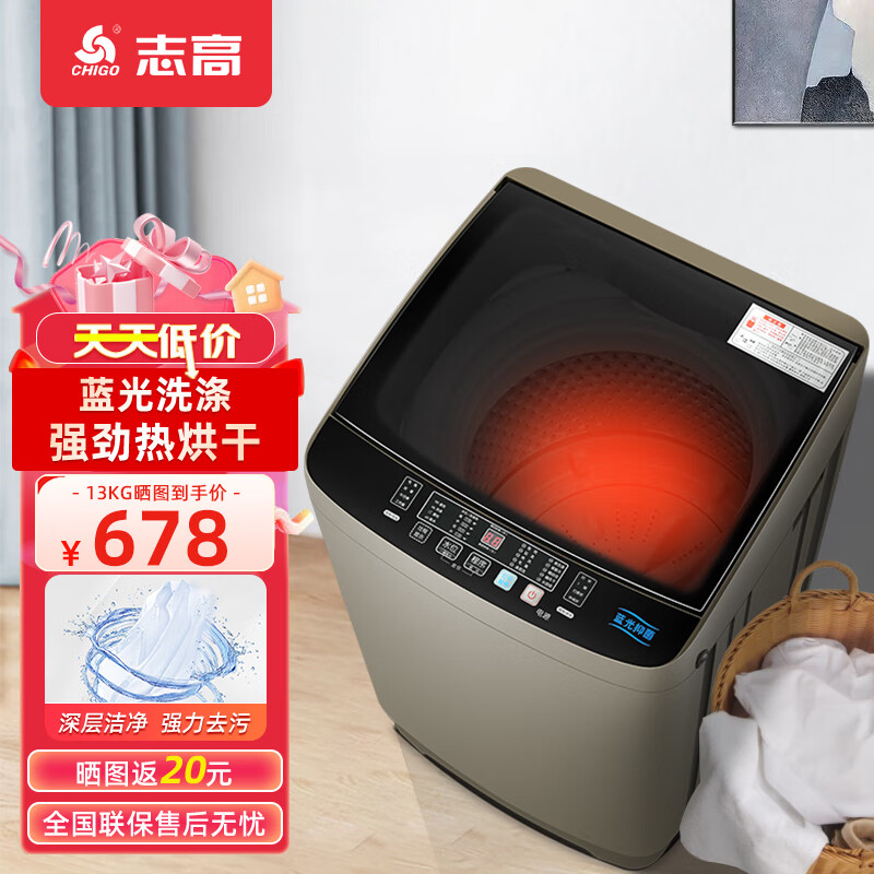 志高(CHIGO)13KG大容量全自动波轮洗衣机家用宿舍租房免清洗智能洗脱一体定制程序XQB130-8189热烘干价格:748.00元!