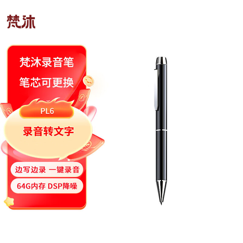 梵沐 PL6笔形录音笔 64G 一键录音 专业高清降噪边写边录 学生商务会议采访培训 录音器 黑色价格:199.00元!