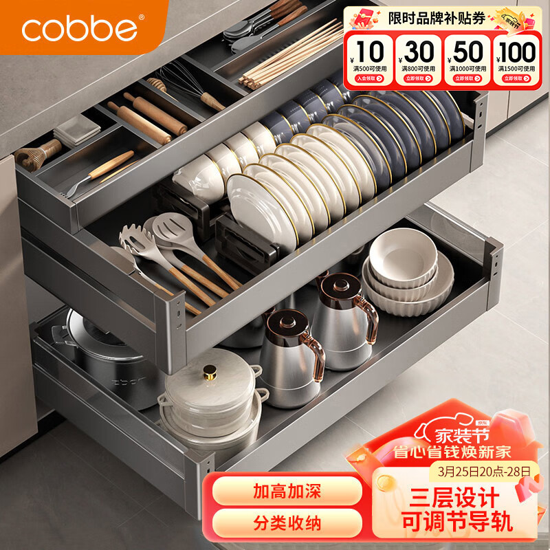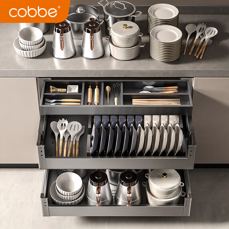 卡贝(cobbe)枪灰厨房拉篮橱柜抽屉式双层碗篮304不锈钢碗碟架置物架加深拉篮价格:808.00元!