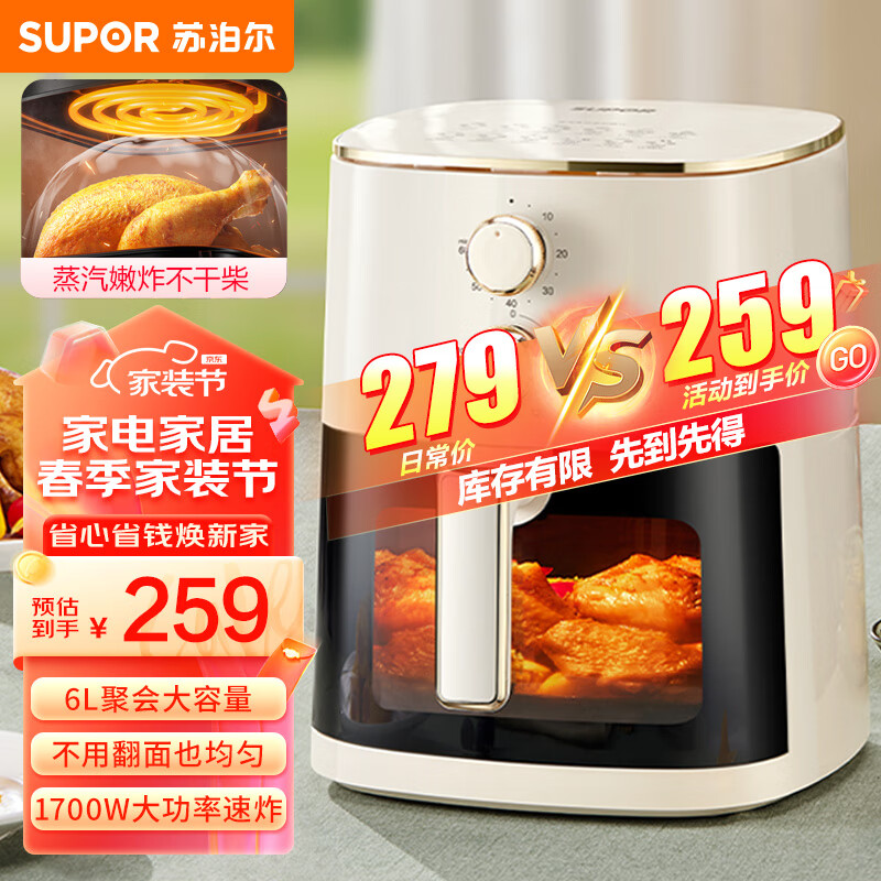 苏泊尔(SUPOR)免翻面空气炸锅 不用翻面 家用多功能 6L大容量 可视 大功率 金属内腔 蒸汽嫩炸 炸锅KJ60D808价格:259.00元!