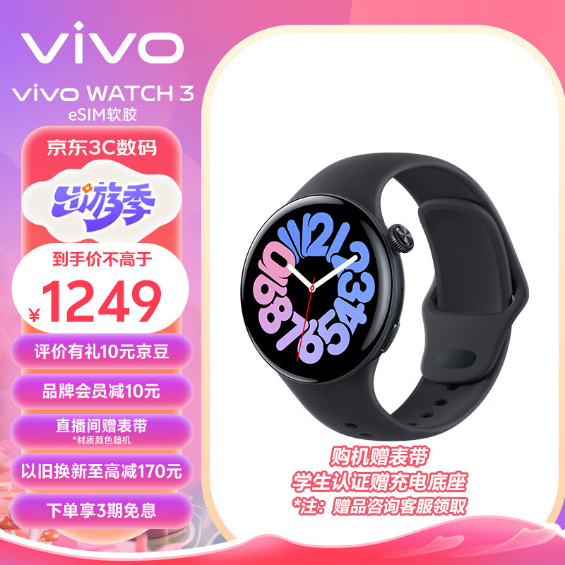 vivo WATCH 3 eSIM软胶版 辰夜黑 AIGC智能手表表盘 血氧心率监测 自研蓝河系统 超长续航 vivowatch价格:1249.00元!