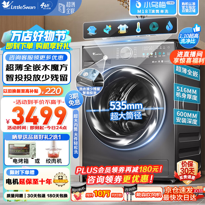小天鹅(LittleSwan)小乌梅洗衣机滚筒10公斤全自动水魔方智能投放1.1高洗净比超薄全嵌旗舰羊毛绿标轻享版M18T价格:3399.00元!