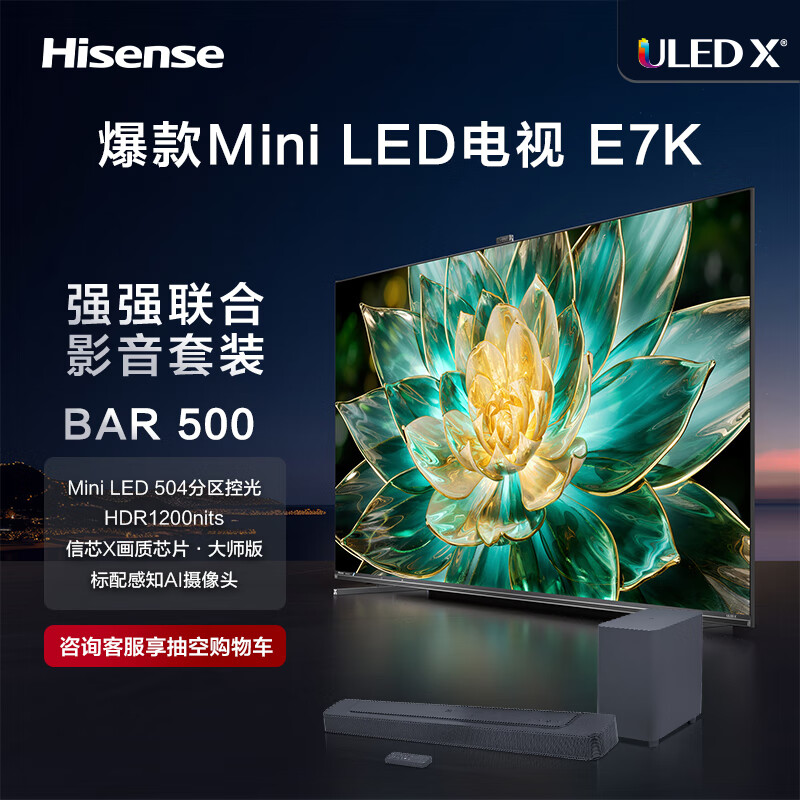 海信电视75E7K+Bar500沉浸追剧套装 75英寸 ULED X Mini LED 504分区 AI摄像头超感知 智能平板电视机价格:10298.00元!