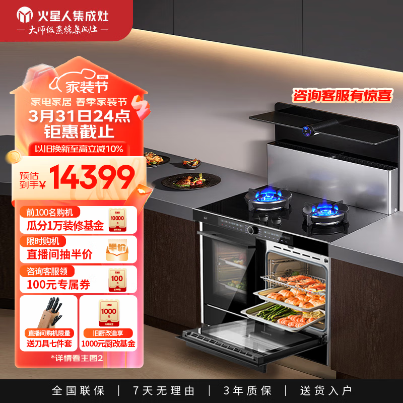 火星人集成灶T70BCZ蒸烤独立集成灶 智能蒸烤炸 家用蒸箱烤箱 燃气灶 液化气价格:14699.00元!
