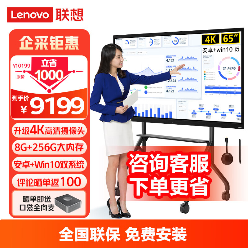 联想会议平板一体机 65英寸 视频会议电视 触控屏 安卓+Win10电脑模块 内置摄像头/含笔投屏器移动支架价格:9199.00元!