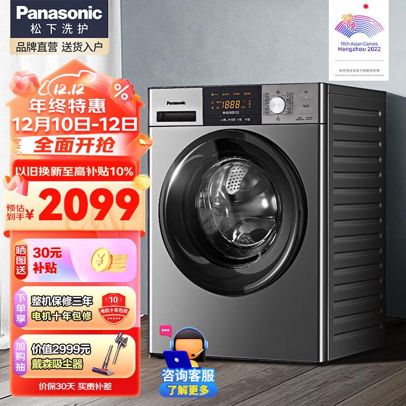 松下(Panasonic)滚筒洗衣机全自动8公斤 BLDC电机 轻音变频 除菌洗泡沫净 节能洗筒自洁 XQG80-3GYEA【除菌洗】以旧换新价格:2099.00元!