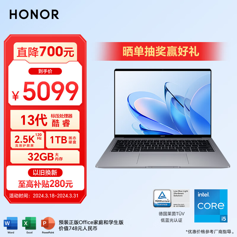 荣耀MagicBook 14 2023 13代酷睿i5-13500H 32G 1TB 2.5K 120Hz高刷屏 14吋高性能轻薄笔记本电脑价格:5099.00元!