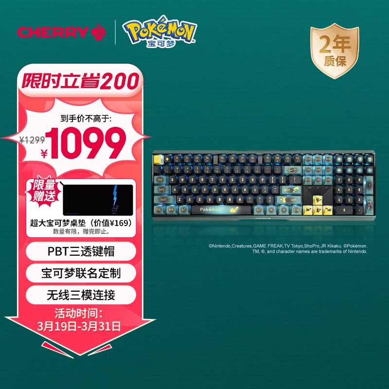 CHERRY樱桃 MX3.0S无线键盘 机械键盘 宝可梦联名款 皮卡丘键盘 三透PBT键帽 蓝牙有线三模 办公游戏键盘价格:1099.00元!