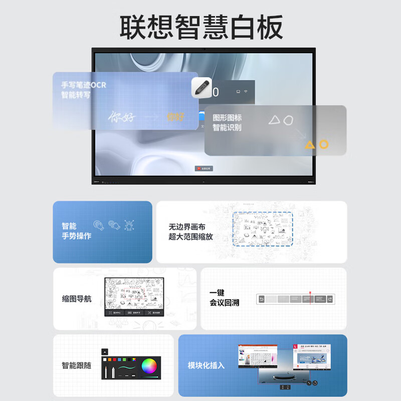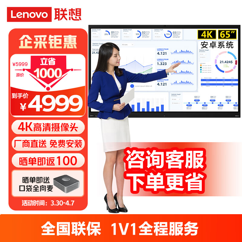联想thinkplus 会议平板一体机 65英寸 视频会议电视 触控屏 教学培训办公电子白板 内置摄像头麦克风价格:4999.00元!