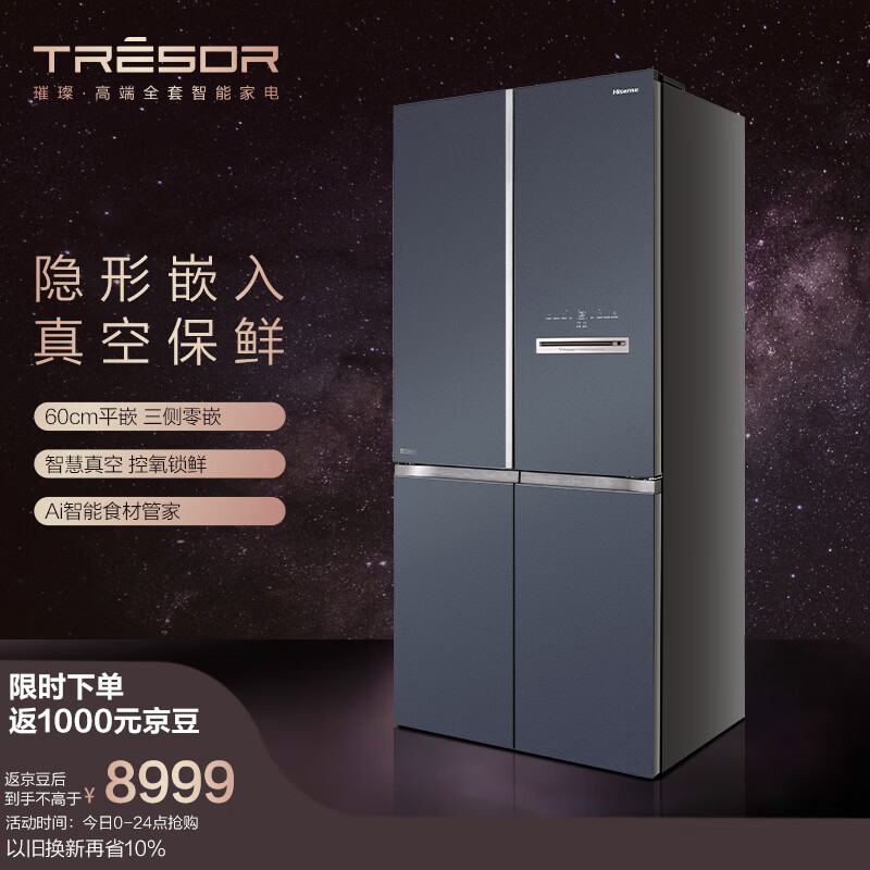海信(Hisense)503璀璨真空魔方冰箱十字对开超薄嵌入零嵌全嵌冰箱全空间离子净味AI智能管理BCD-503WTDGVBPIVC2价格:9999.00元!