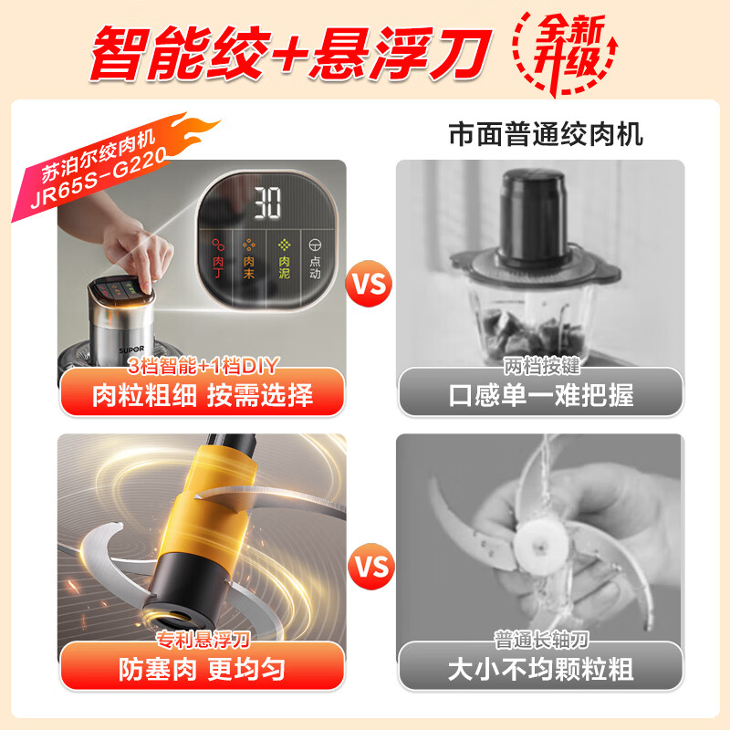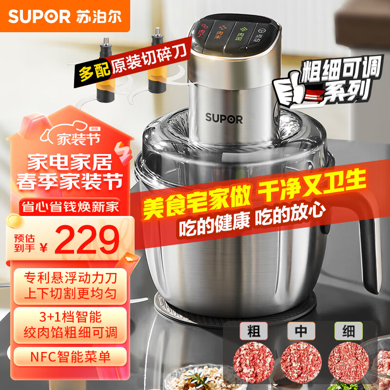 苏泊尔(SUPOR)绞肉机家用 电动多功能不锈钢悬浮刀料理搅拌机2.2L大容量馅婴儿辅食机 可调粗细搅肉机JR65S-G220价格:229.00元!