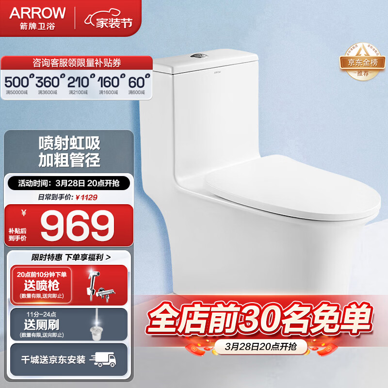 箭牌(ARROW)抽水马桶家用卫浴虹吸坐便器普通座便节水坐厕 1级水效AEB12617L价格:1269.00元!