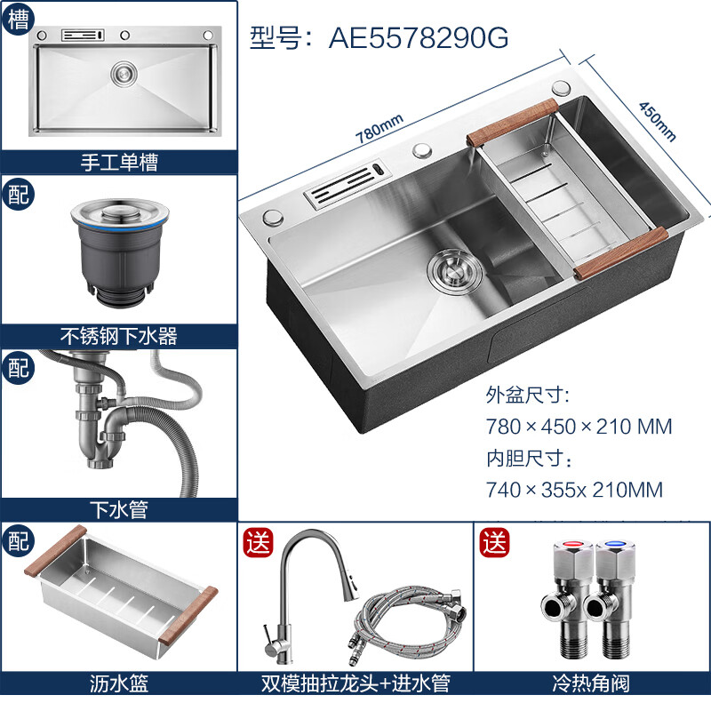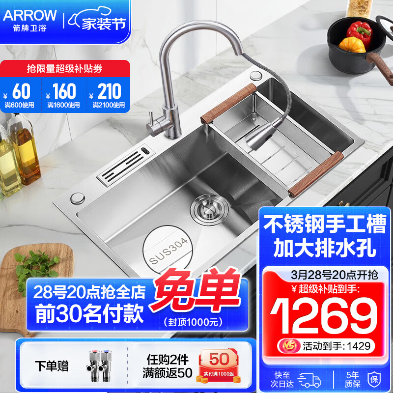 箭牌(ARROW) 304不锈钢加厚手工水槽大单槽厨房水槽洗菜盆一体盆大单槽 78*45手工槽(含沥水篮+龙头)价格:1609.00元!