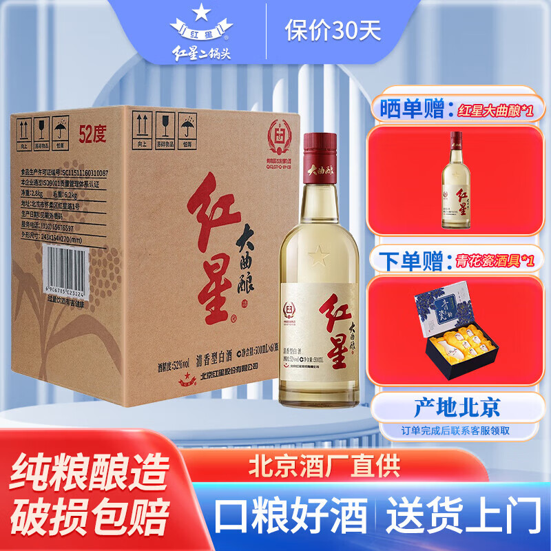 红星【产地北京】北京二锅头52度大曲酿清香型纯粮白酒500ml*6瓶整箱价格:408.00元!