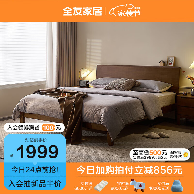 全友家居 轻奢实木功能床可调高床头带置物台双人主卧大床1.8米DW1201价格:2855.71元!