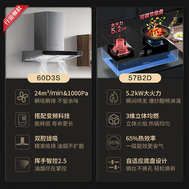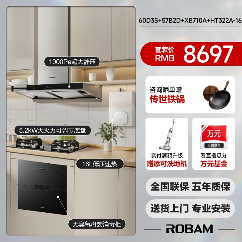 老板(Robam)厨房多件套 欧式24风量双腔吸油烟机挥手 灶具消毒柜燃气热水器60D3S+57B2DT+XB710A+HT322A-16价格:8697.00元!