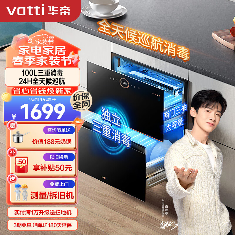 华帝(VATTI)消毒柜家用嵌入式 100升大容量两门三抽消毒碗柜 24H全天候巡航紫外线高温三重消毒i13036价格:1699.00元!