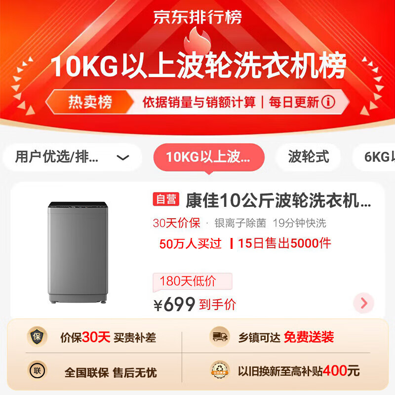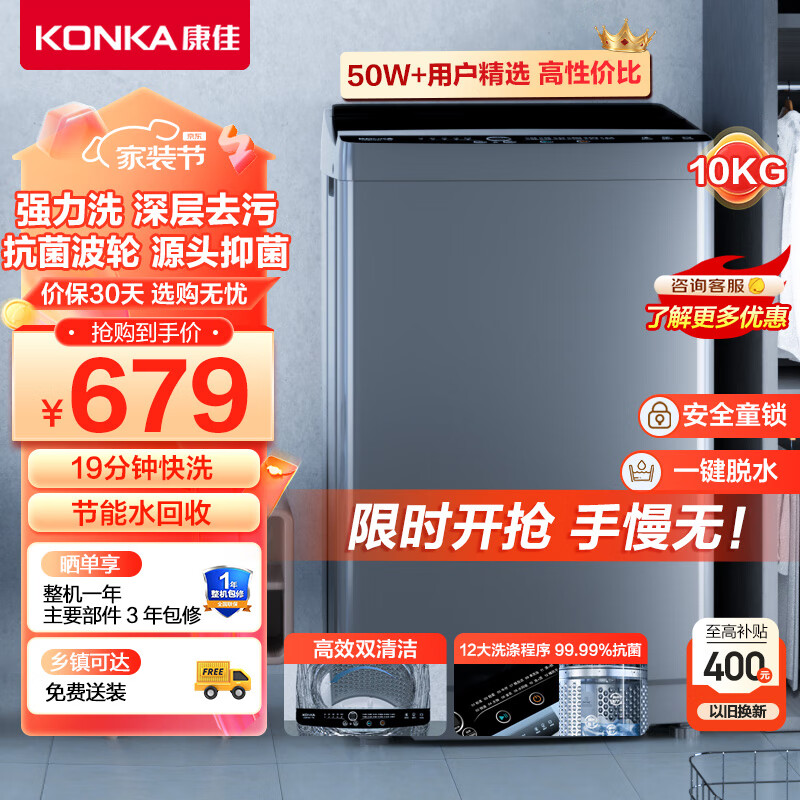 康佳10公斤全自动波轮洗衣机大容量 七重智控 一键脱水 家用租房 高效除菌 桶自洁桶风干XQB100-718价格:679.00元!