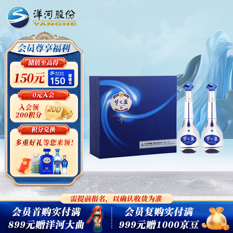 洋河 梦之蓝M3 45度 500ml*2瓶 礼盒装 绵柔浓香型白酒价格:1098.00元!