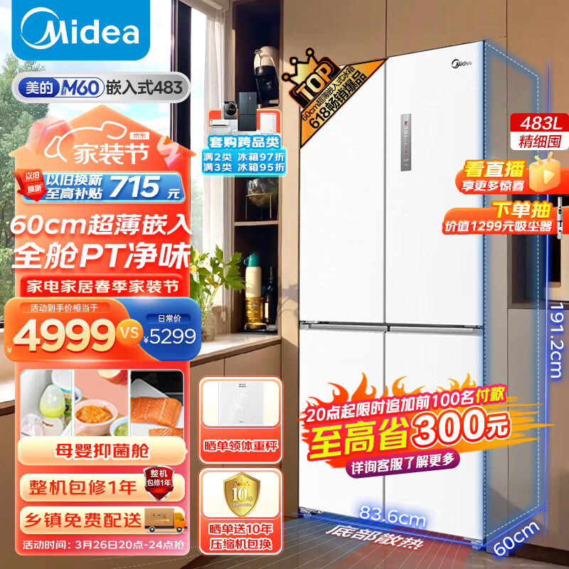 美的(Midea)M60系列60cm薄483升十字双开四开门多门超薄嵌入白色无霜一级变频家用智能电冰箱BCD-483WSPZM(E)价格:5799.00元!